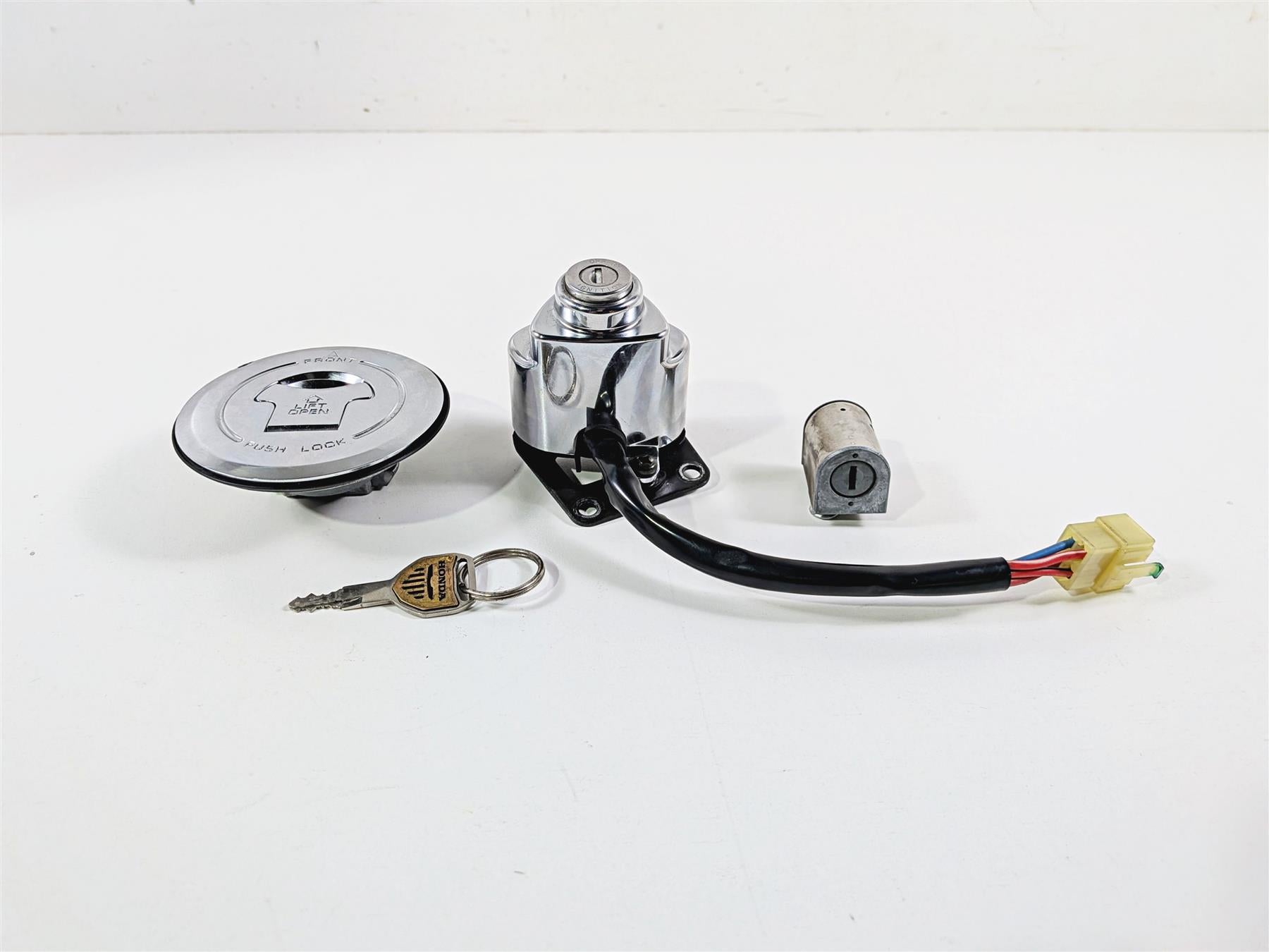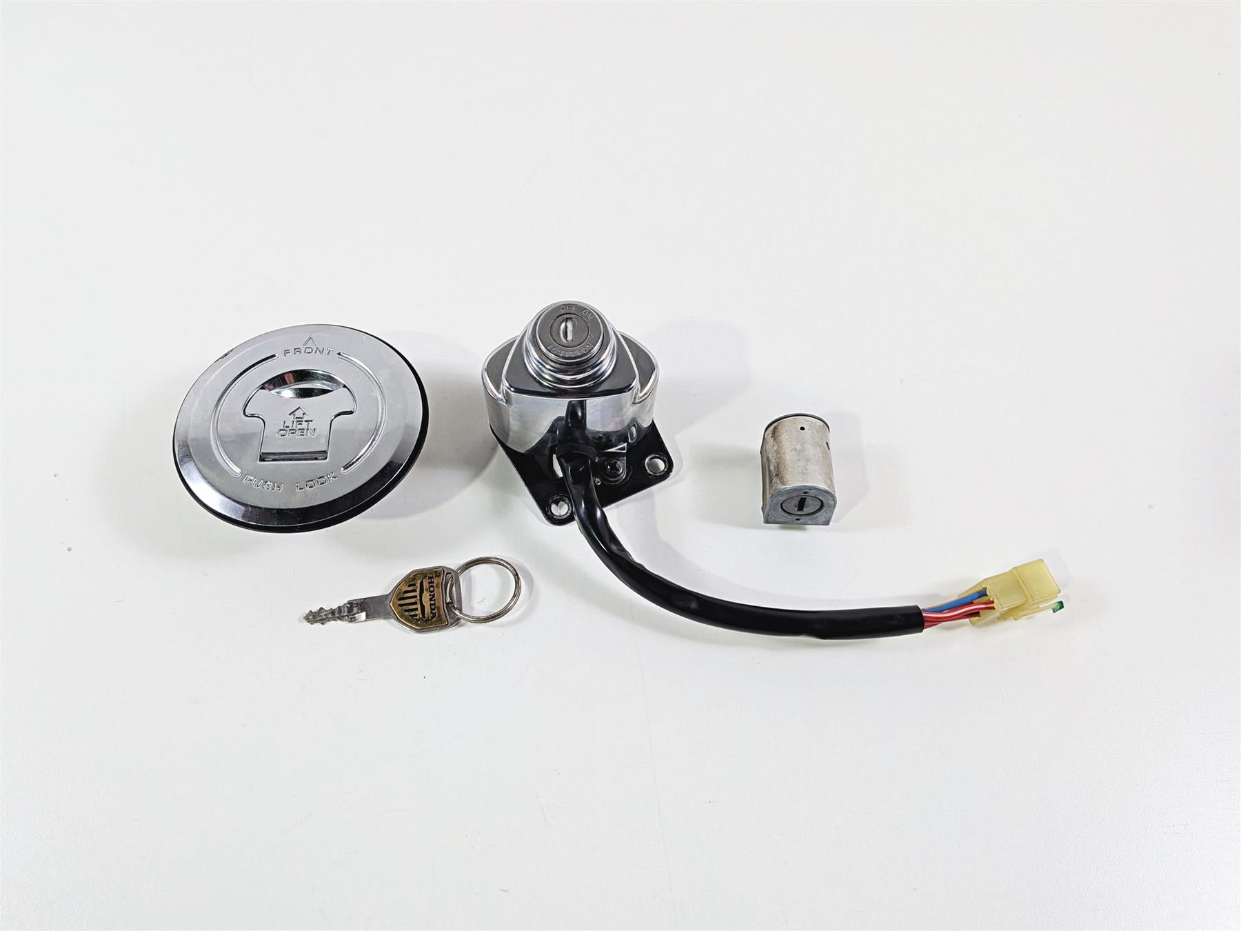 This Ignition Switch Key Lock Tank Cap Set was parted off the described Bike that had 16710 original miles at the time of disassembly.
