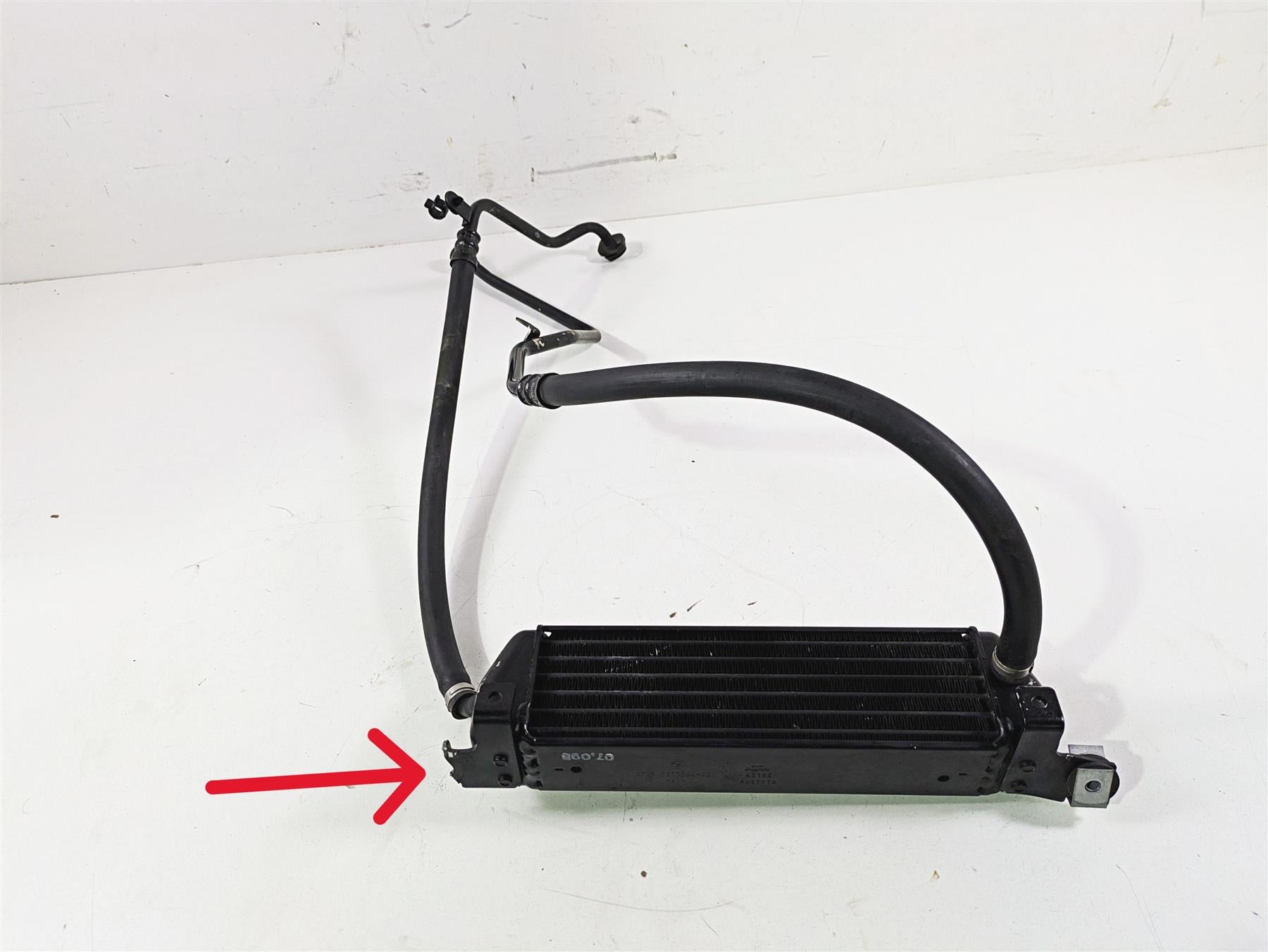 Comments: has bent and broken mounts (red arrow). No leaks.