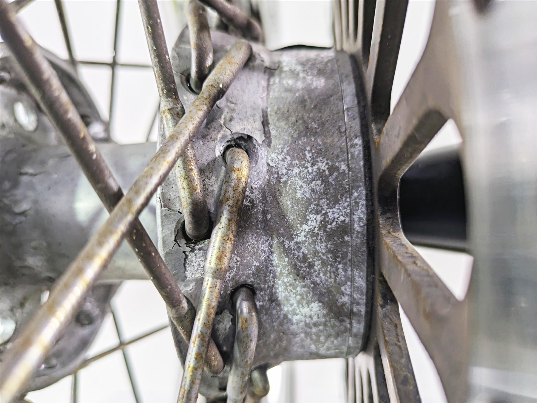 Comments: This spoke wheel shows rust & paint damage. Spins straight with runout of .81mm. Has good bearings. Rim bed is nice.