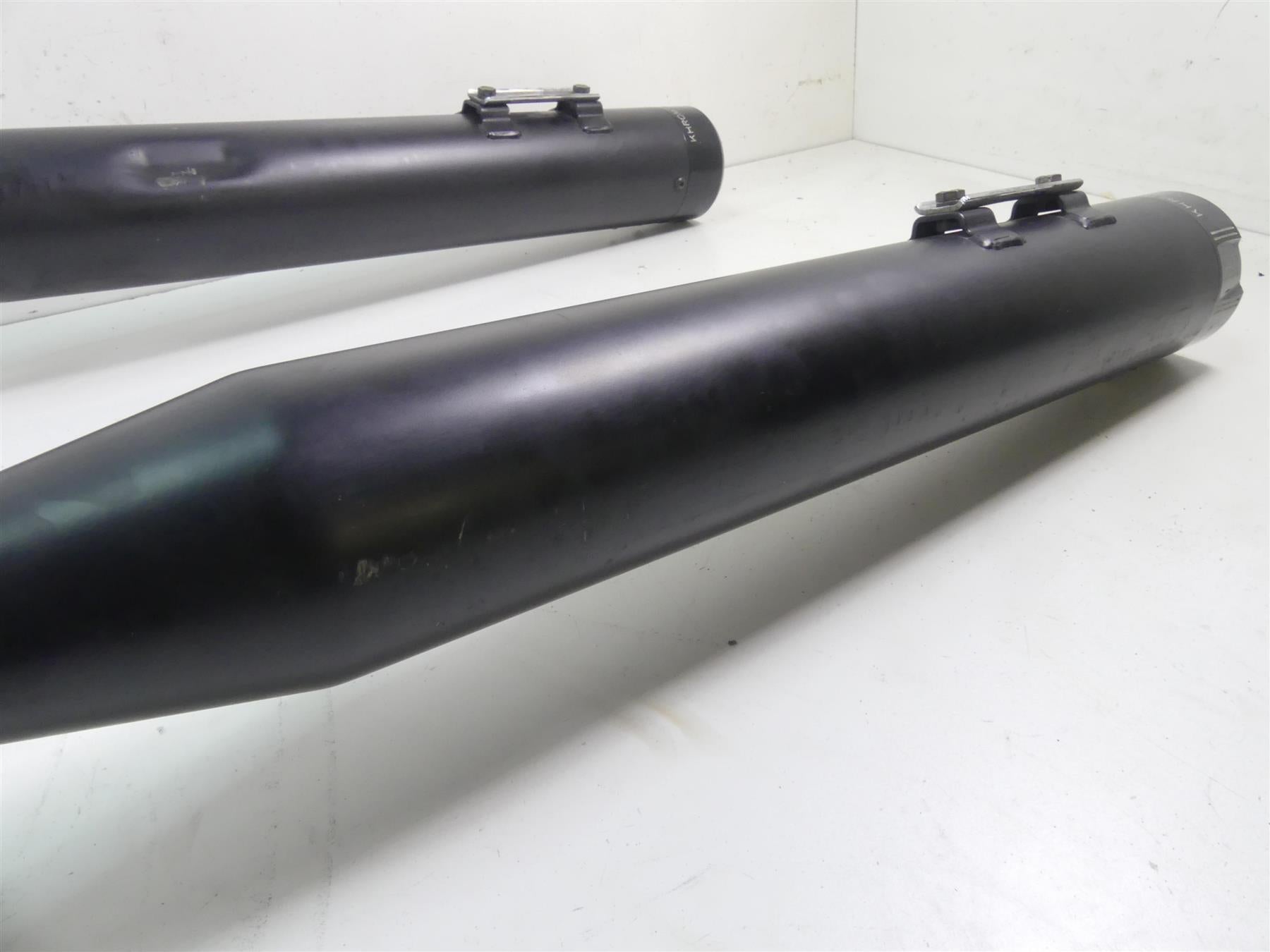 Comments: this is a set of Khrome Werks DOMINATOR 2:2 3-STEPPED HEADER, 4.5" MUFFLERS W/ TRACER TIPS, BLACK. Heat shields and mufflers show some rash marks as you can see in pics. Baffles inside.