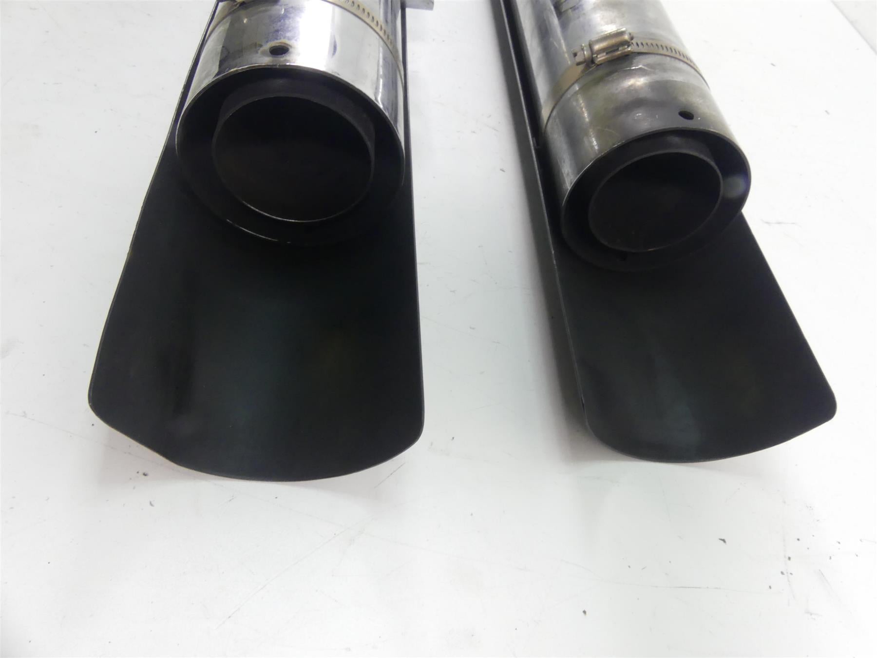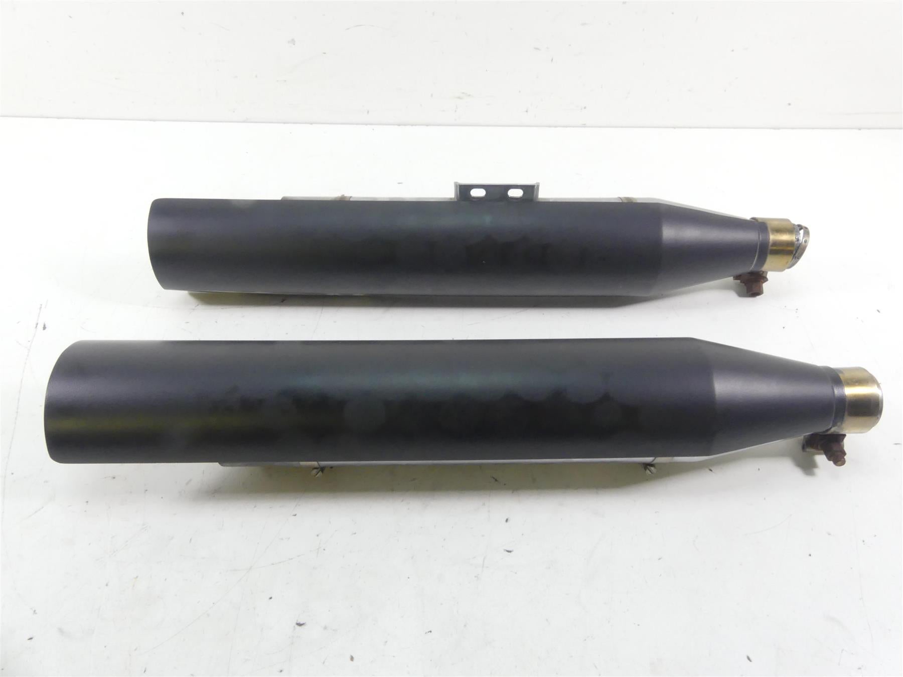 Comments: One heat shield shows deep rash marks. The heat shields are stock but the muffs are aftermarket performance pipes. There is no brand name and no numbers on them. They could be S&S. Not sure. End caps are missing. They have reducers to fit the oem headers