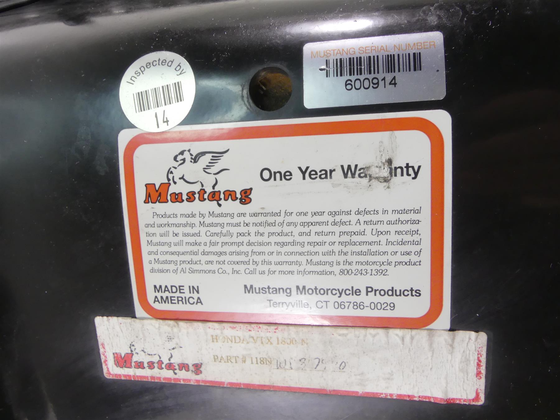Comments: This is a Mustang Wide Touring Vintage Two-Piece with bracket for backrest seat set. No tears.