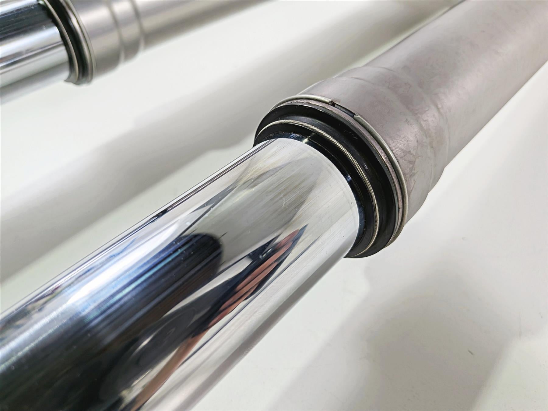 Comments: lower 60mm upper 54mm. The forks are straight and do not leak. The lines in the travel are can not be felt with fingernails. It is just normal wear and does not effect the function. The front end comes as shown with upper and lower triple tree, the wheel spindle / axle and handle bar holder or riser set. It can be used as is but we always recommend to change the oil and seals on used forks since we do not have the service record from the bikes we part out