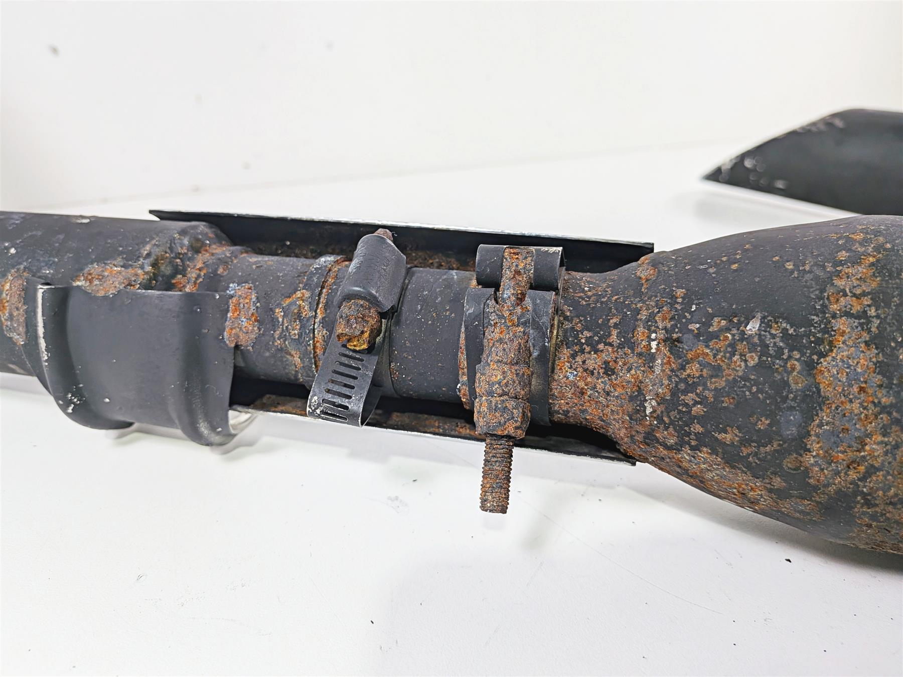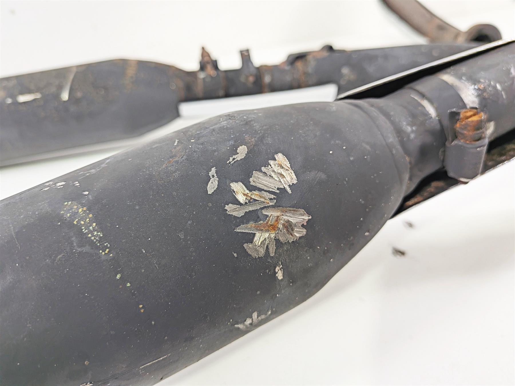 Comments: has baffles inside. Shows a lot of rash, rust and damage to heat shields. Mufflers have been painted over with black paint. Missing some mounting hardware.