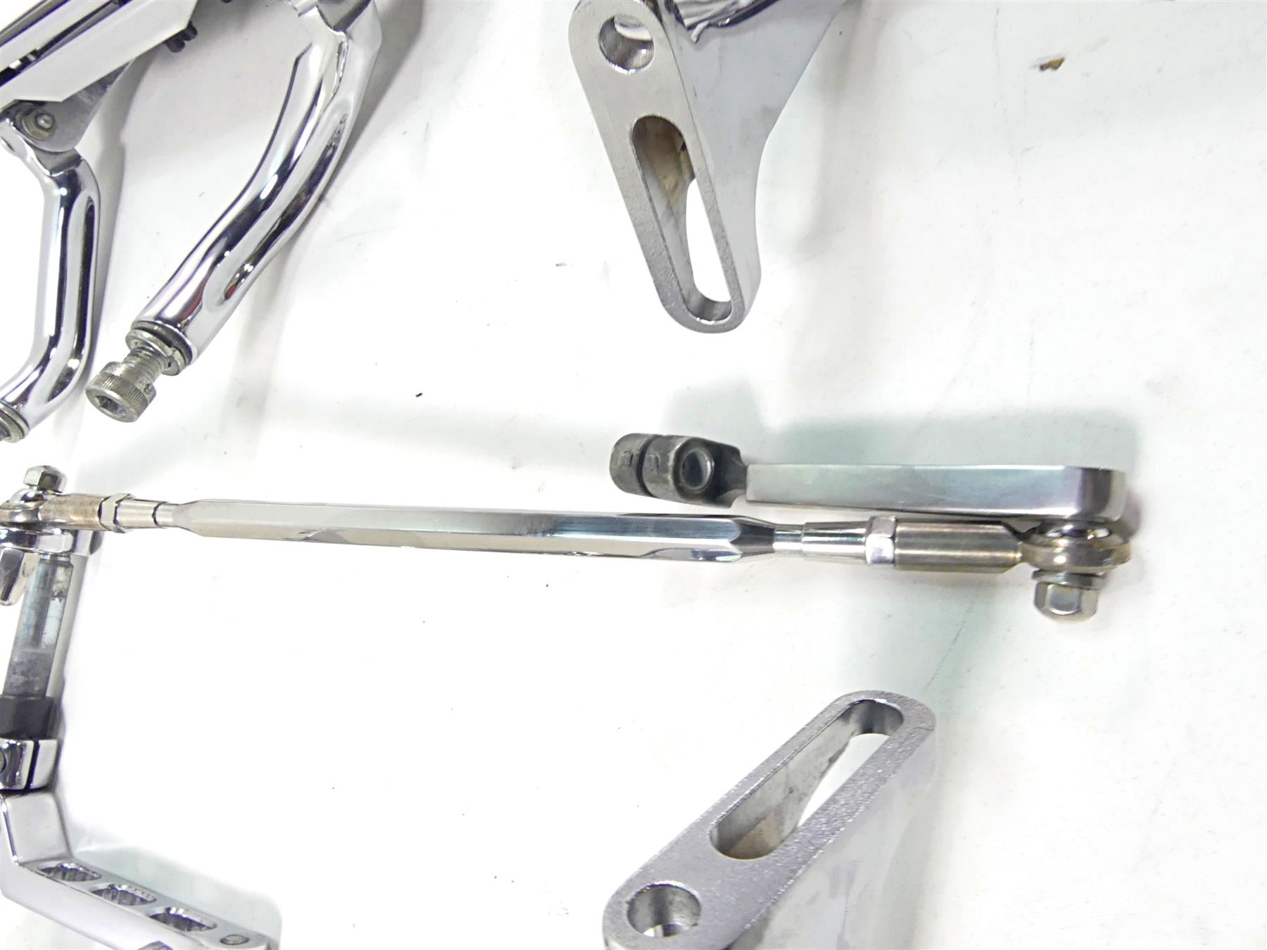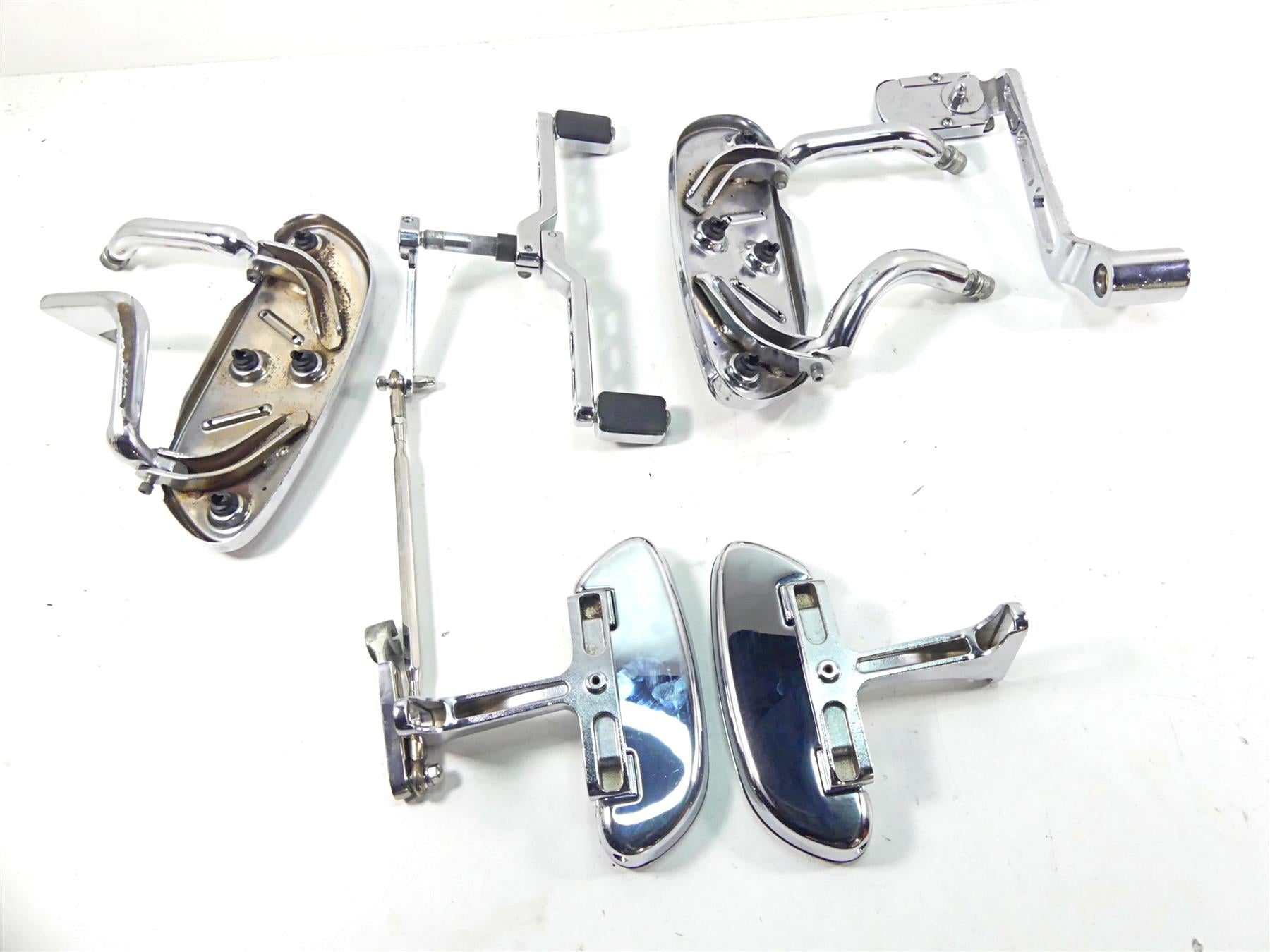 Comments: This set comes as shown. Both front and rear chrome floor boards with shifter and rod and brake pedal. The boards are in real good shape. The brake pedal has some chrome issues and the front mounts show some rash.