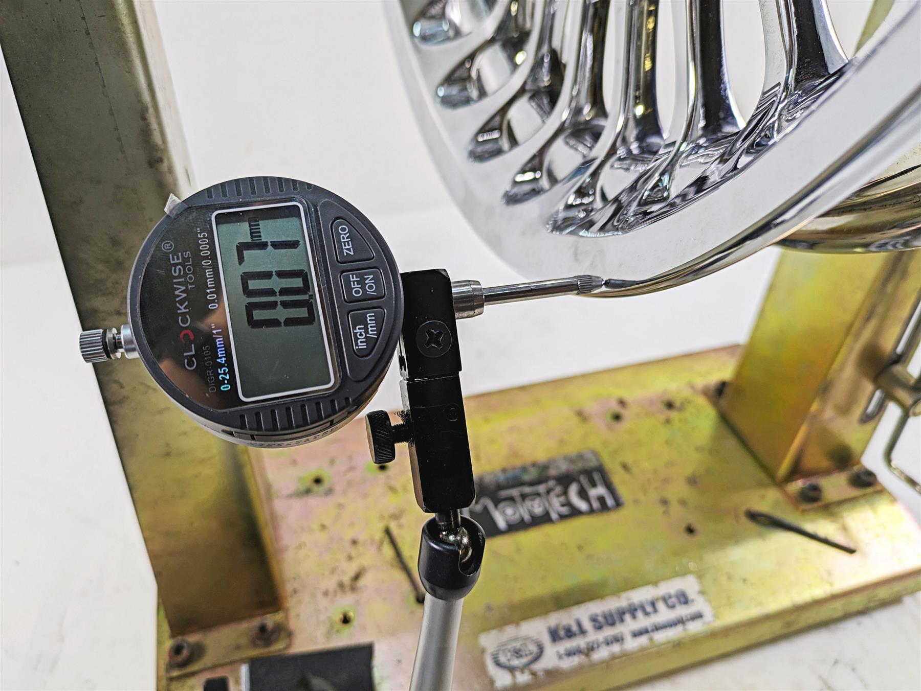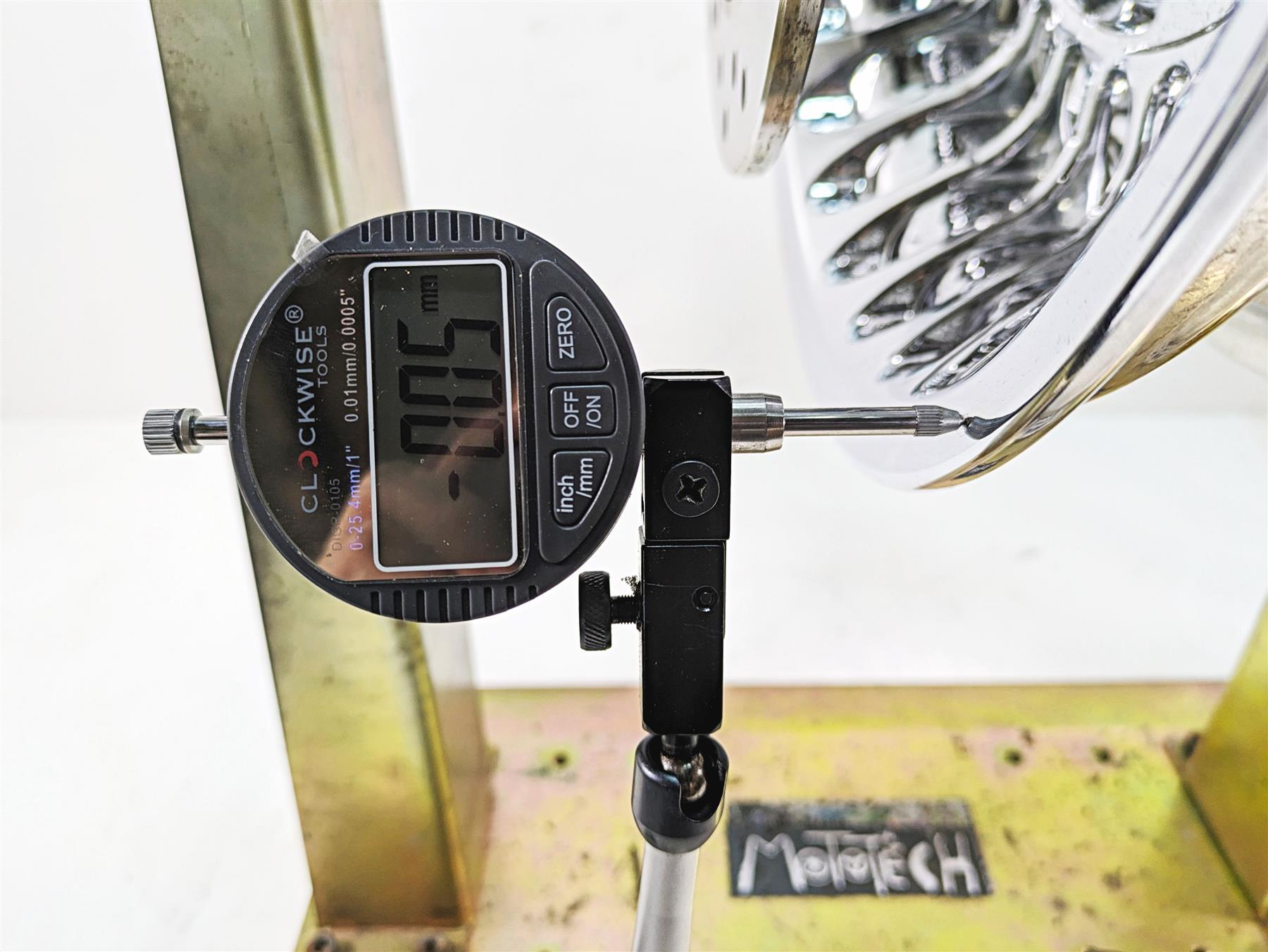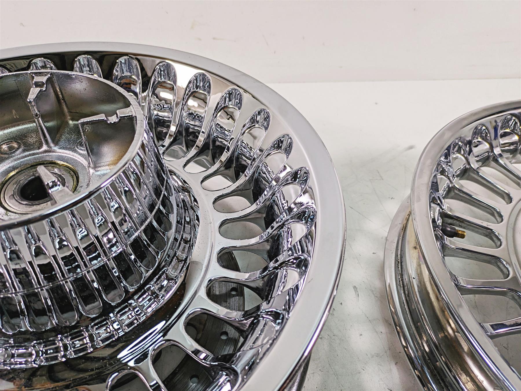 Comments: this is a set of real nice oem look cast/28 spoke wheels in chrome. The 17x3 front wheel spins straight with runout of .07mm and has good bearings. The 16x5 rear wheel spins straight with runout of .05mm and has good bearings.